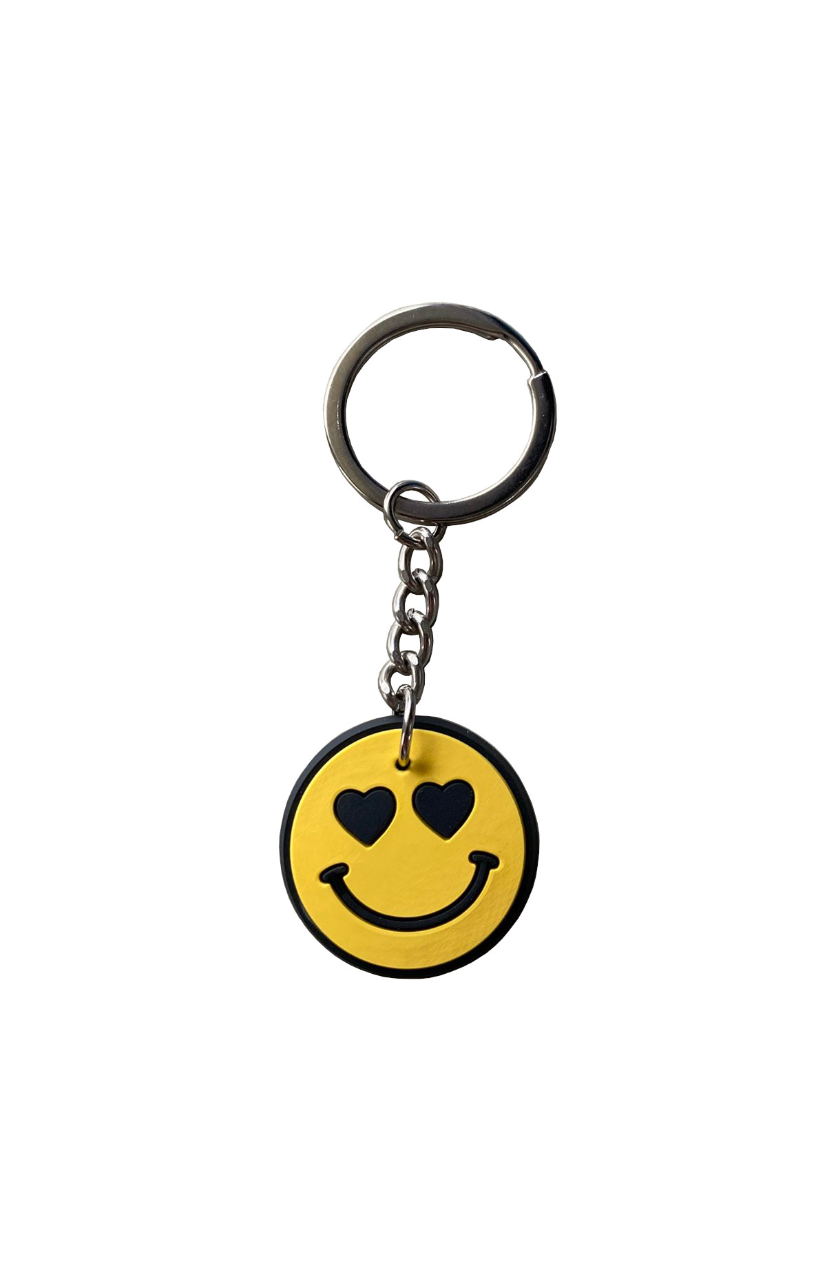 Laat je sleutels stralen met deze schattige smiley sleutelhanger met hartjesogen. Perfect voor iedereen die houdt van vrolijke accessoires met een vleugje liefde! Deze sleutelhanger is enkelzijdig bedrukt en gemaakt van stevig PVC, waardoor hij lang meegaat en ideaal is voor dagelijks gebruik.